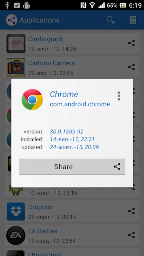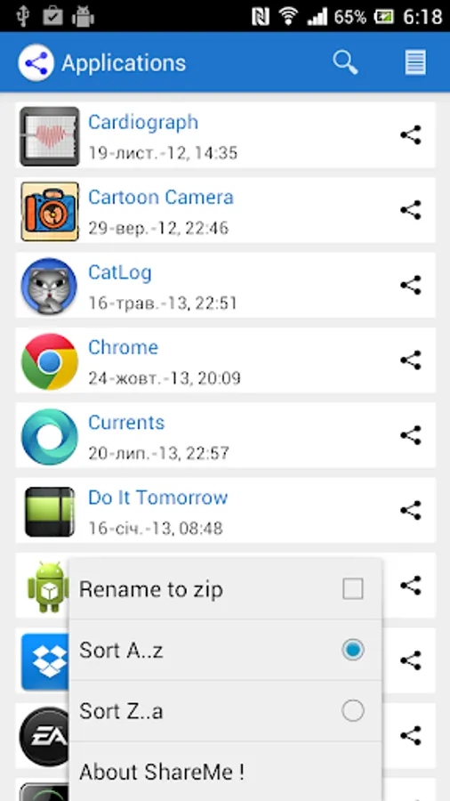 Found a great app and want to share it with a friend or tell the world about it ? With ShareMe that's no really a problem now ! You can easily select any application from installed on a device, and share both link to the play market and application via e-mail, bluetooth and NFC.