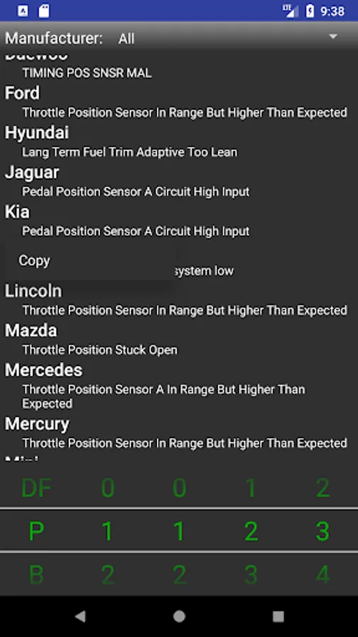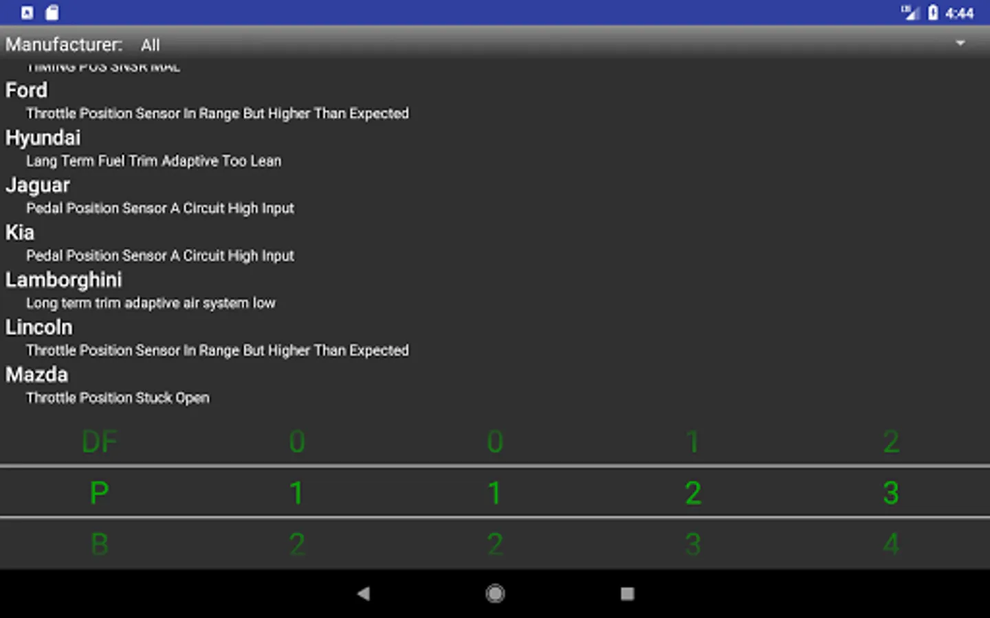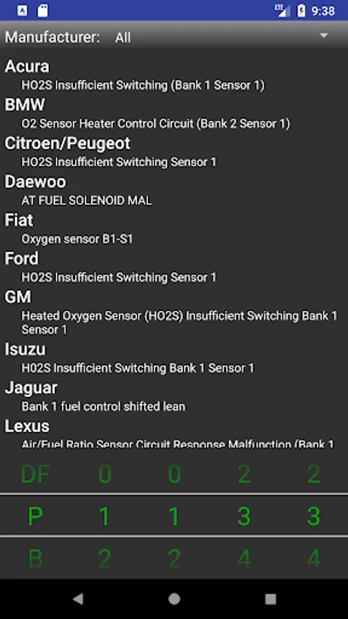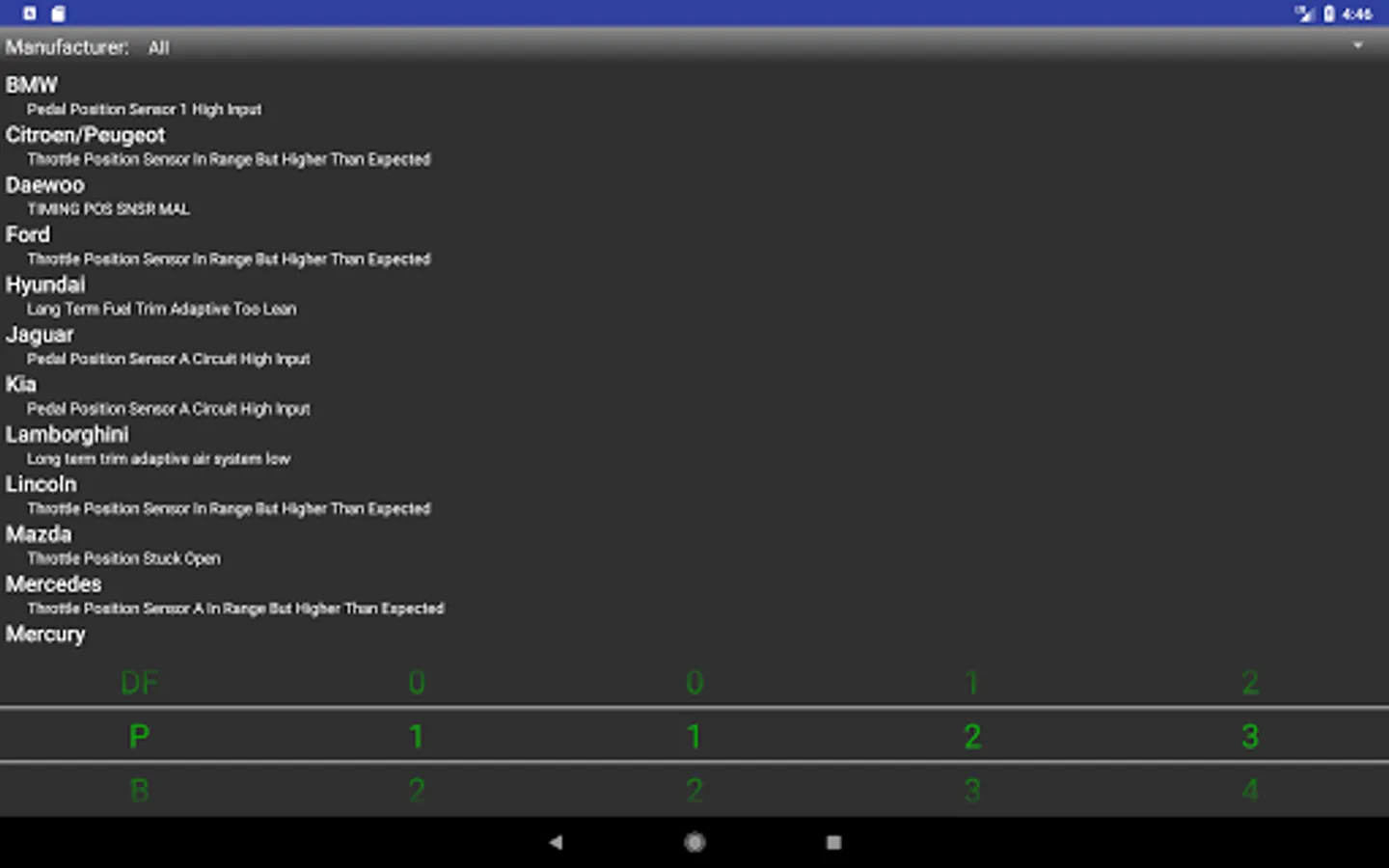 If you want to get all descriptions you can buy FULL version ( http://goo.gl/hk0ym ) which contains more than 18500 error descriptions for almost 50 car manufacturers.