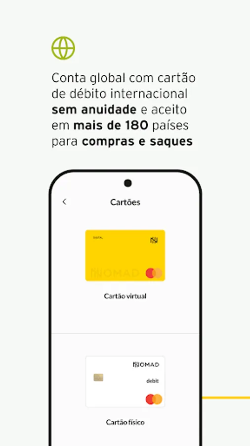 - Use the Nomad card for purchases in physical and virtual stores, and avoid fees. Make purchases abroad with practicality and economy;
