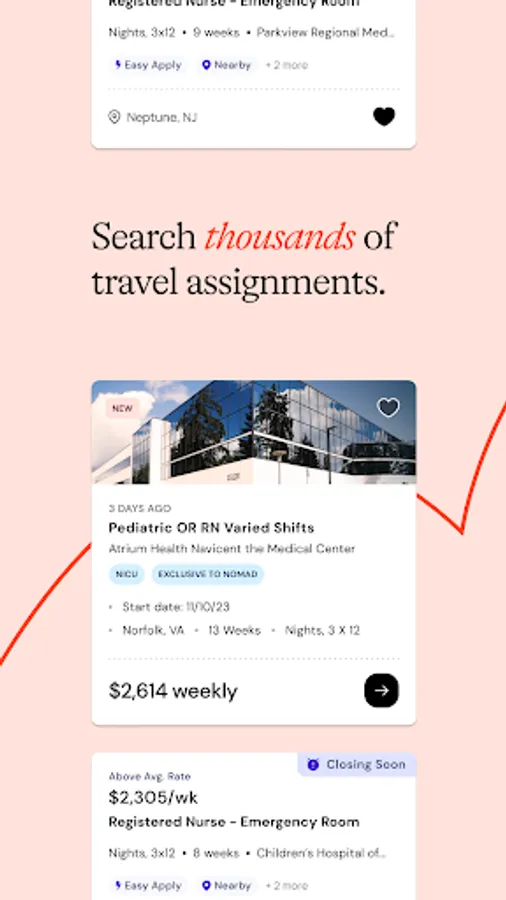 Nomad: Travel Healthcare Jobs makes it easy to find and apply for traveling clinician jobs across a wide variety of healthcare disciplines, including travel nursing and allied health. Search for open positions in trusted facilities all over the country, chat with a team of experts as you navigate the hiring process, and track your shift hours easily.