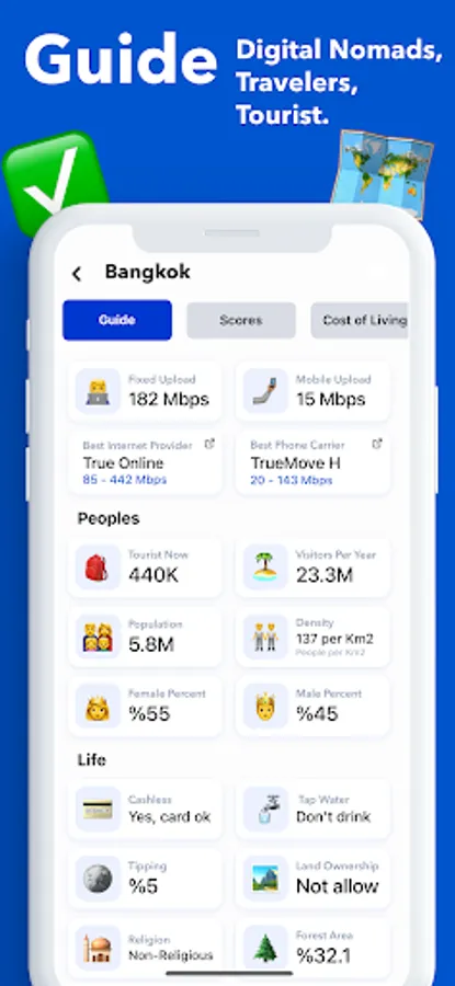 City guide – With our app, you can find country, continents, currency, time zone, trip duration, internet insights, best brands, population, life information, tipping percent, forest area, religion, power adapter, and more.