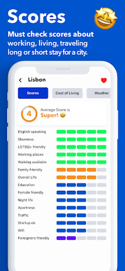 Scores – Get an idea of a city with our Nomad Life scores, such as English Speaking, Foreigners friendly, LGBTQ+ friendly, Wifi quality, Traffic, and more.