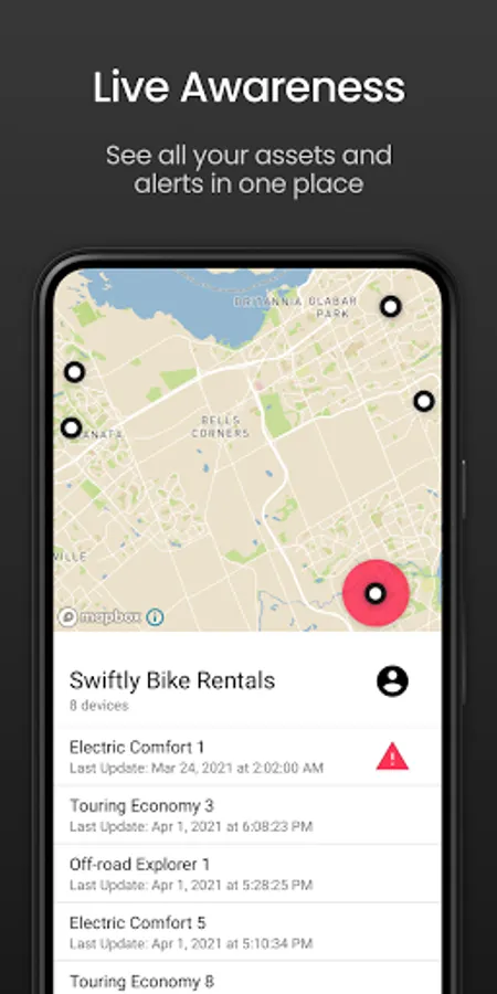 • Movement and data-driven alerts: Receive push notifications, and real-time in-app updates, when equipment moves or when properties of your equipment reach pre-configured conditions.