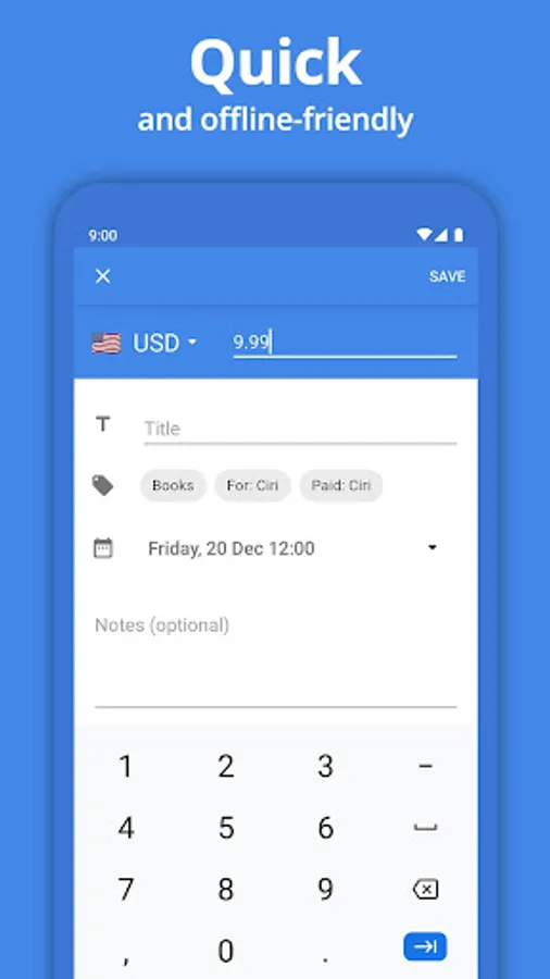 QUICK: Expenses provides only essential features. You can track your budget easily, even offline.