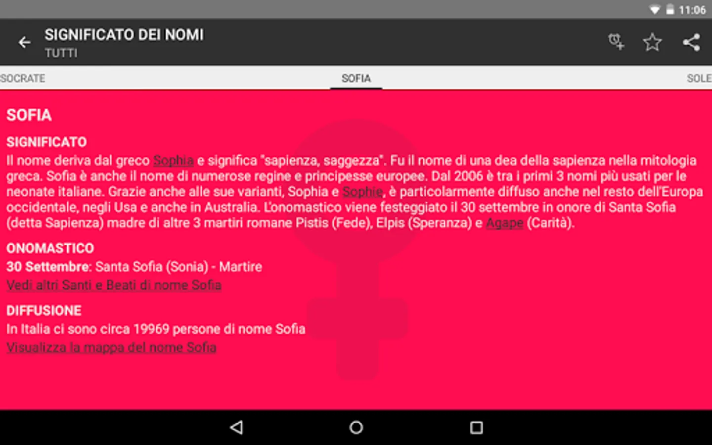 In this FREE version you can find well 1,000 Italian and foreign names full of meaning, name day and diffusion in Italy.