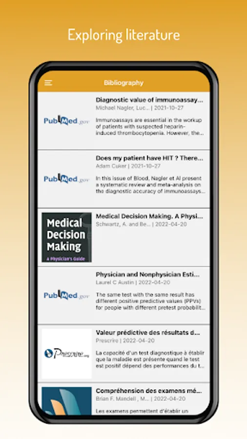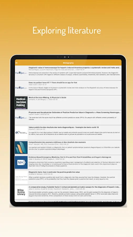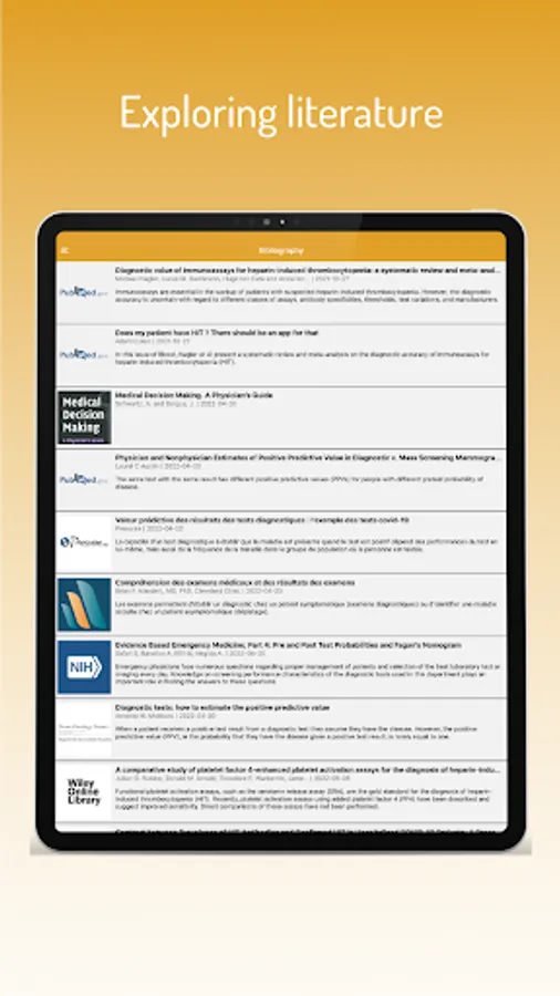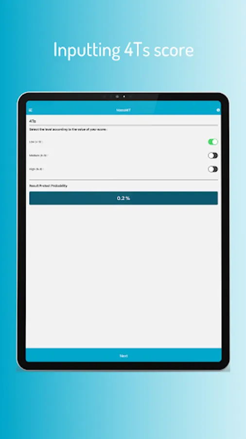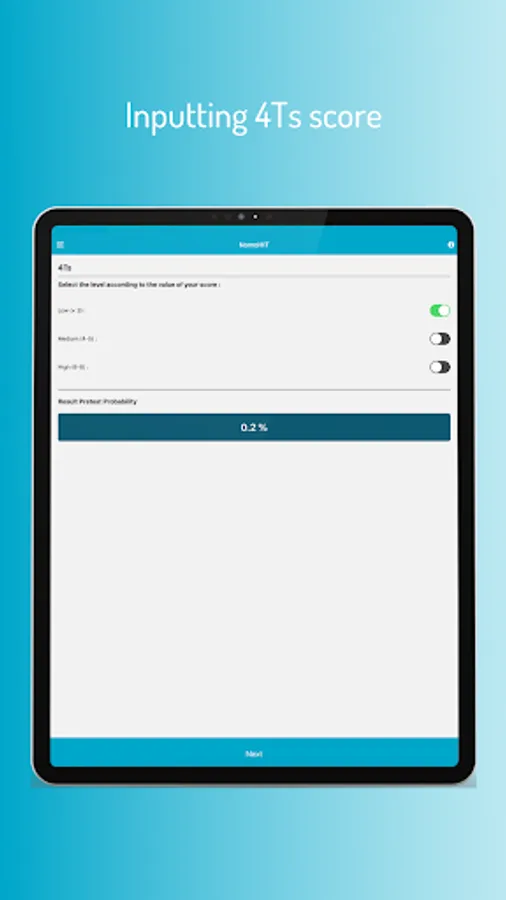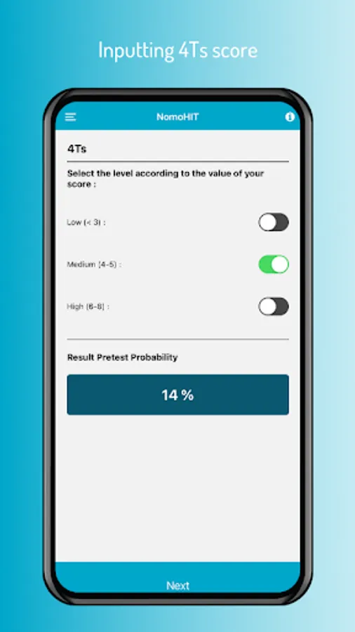 NomoHIT is an easy-to-use mobile app to help in assessing the information gained from heparin induced thrombocytopenia (HIT) diagnostic workup, through the 4Ts scoring and subsequent immunological and functional lab testing, and in turning it into a probability that a given patient has or has not HIT.
