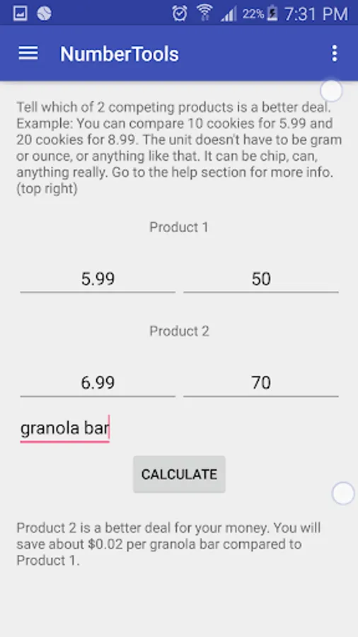 Determine which of 2 products has better value.