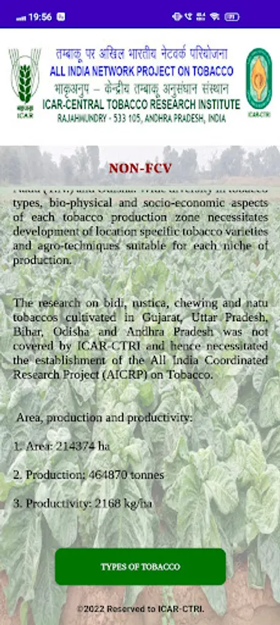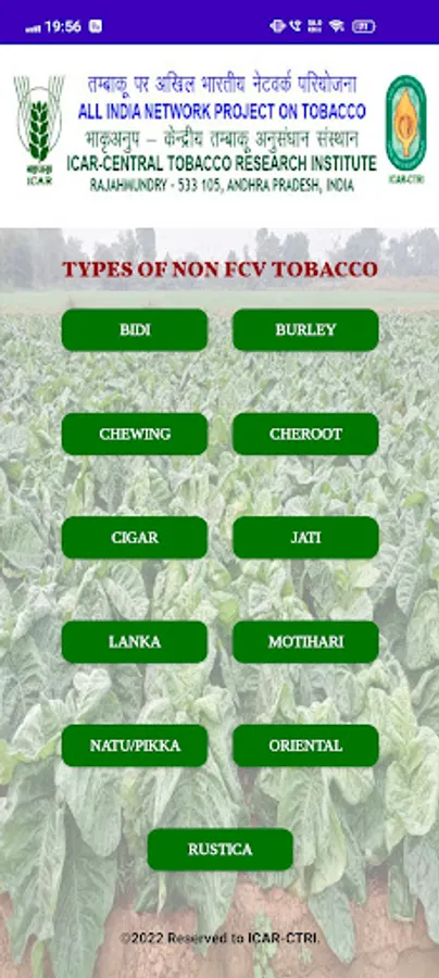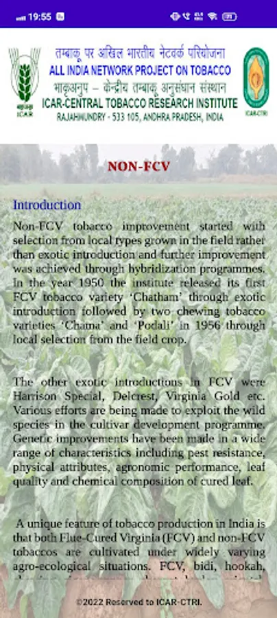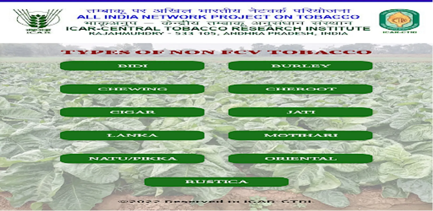 Tobacco improvement through co-ordinated multi-disciplinary and multi-location research on different tobacco types (FCV, Bidi, Natu, Chewing and Hookah etc.) grown in their respective niche areas in the country.