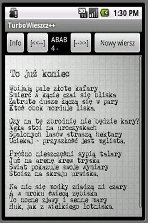 Poetry Generator for Android. Based on the previous version written by me on the Commodore C-64 sometime in 1993, and based on the idea presented in the "Magazyn Amiga" magazine by Marek Pampuch. Also inspired by the version written by Tomek Gryszkiewicz (aka Grych) for Amiga and other platforms (unfortunately, Google's censorship does not allow you to write which one, but it's easy to guess that for non-Android).