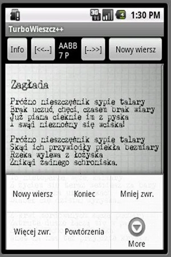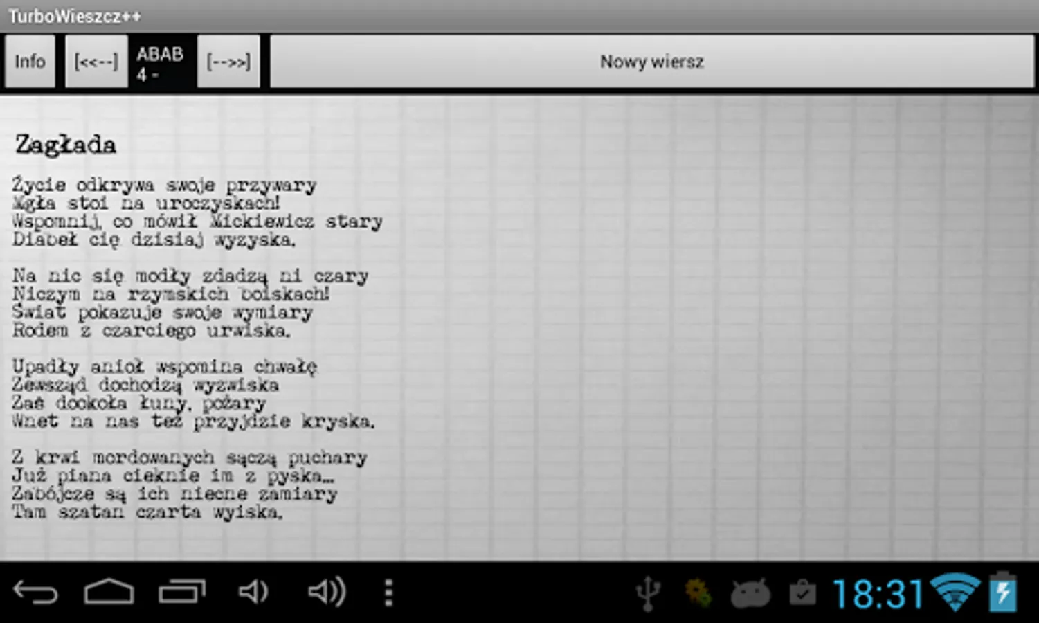 The program allows you to generate simple poems that, upon closer inspection, reveal hidden depths. The user can choose: the number of stanzas, the type of rhyme, the option of repeating lines and the font size.