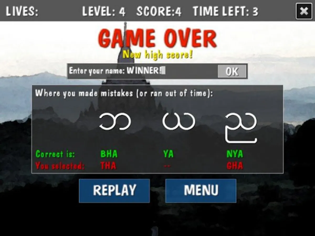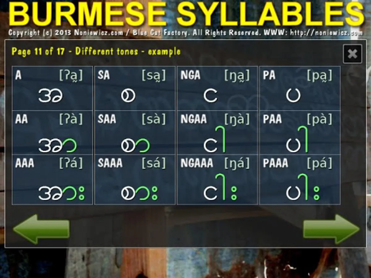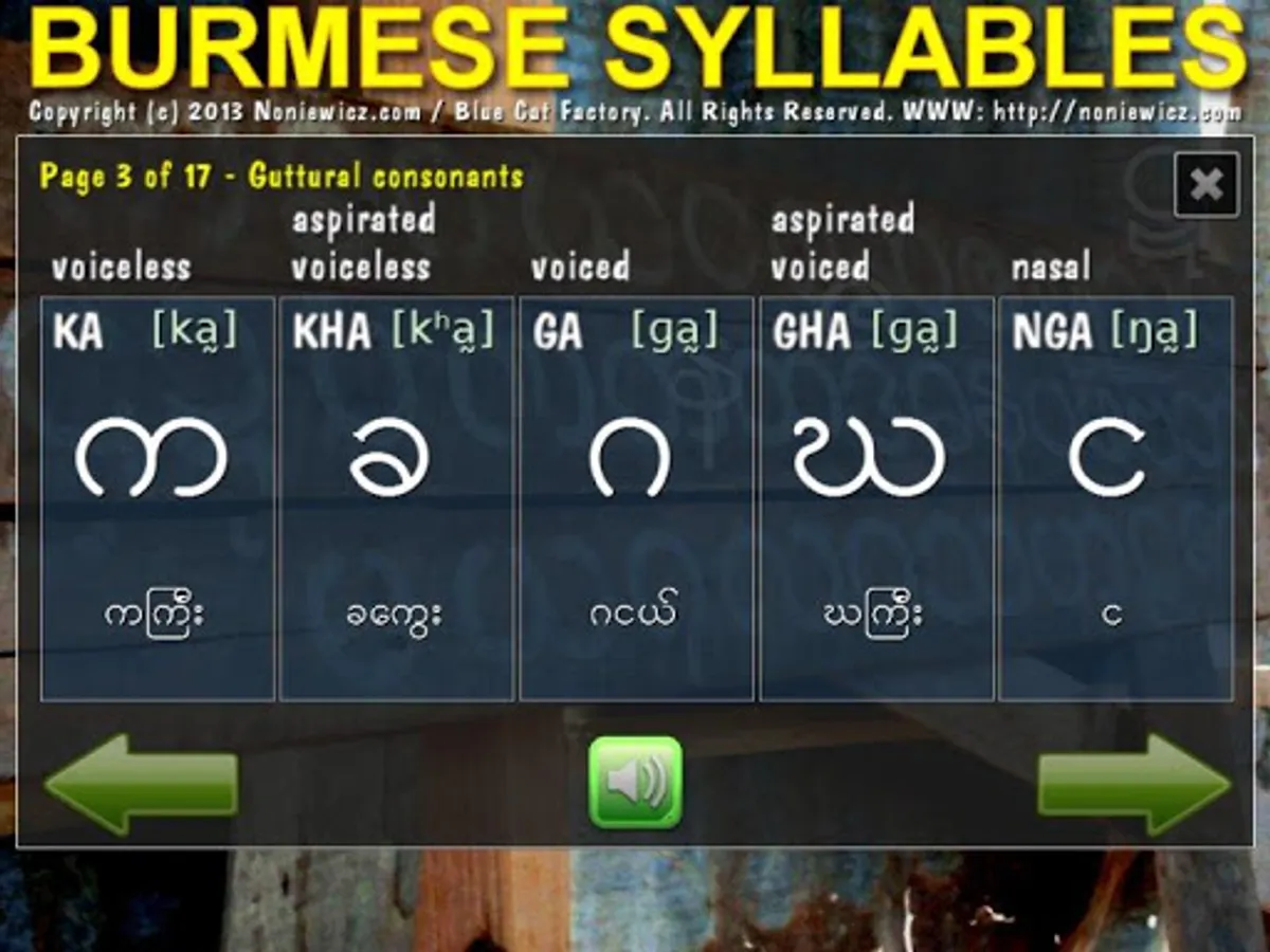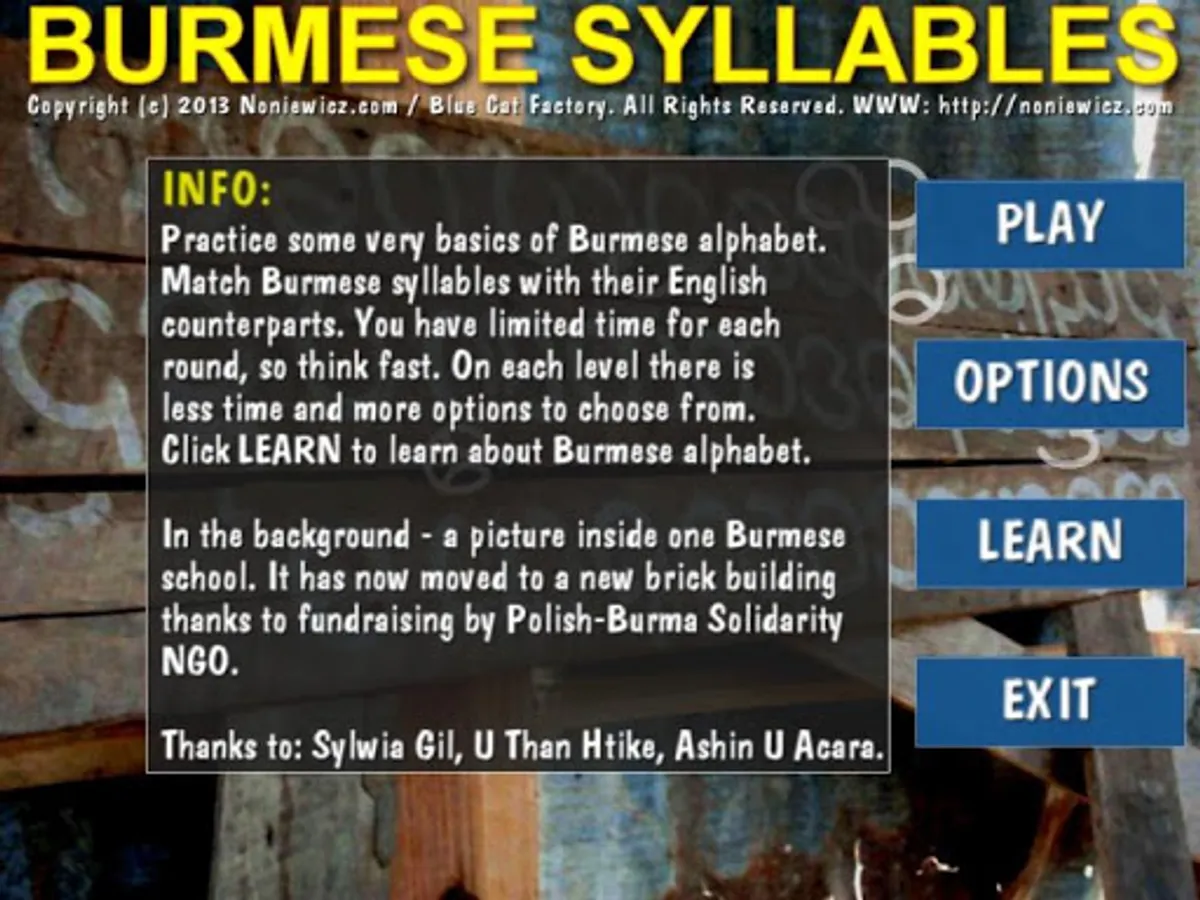 To learn more press the LEARN button on the main screen and visit the school where you will find information and explanation about Burmese alphabet. The lessons are basic, but they provide a clean picture of how Burmese alphabet looks, how it is divided into groups and which syllables are which. The game provides phonetic notation in IPA standard that formally describes the pronunciation. Also you can hear how do the main 25 syllables sound in Burmese.