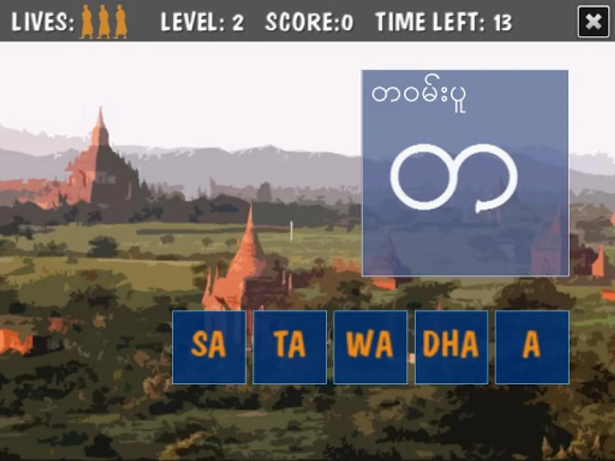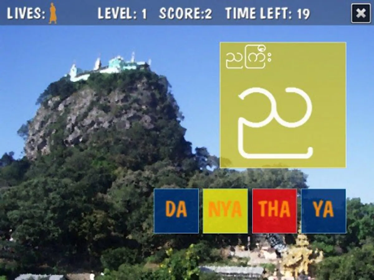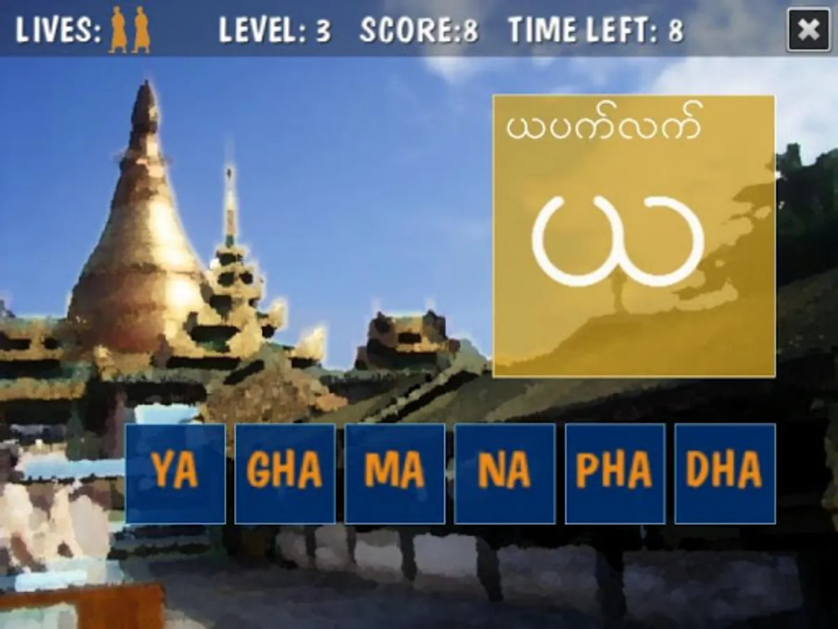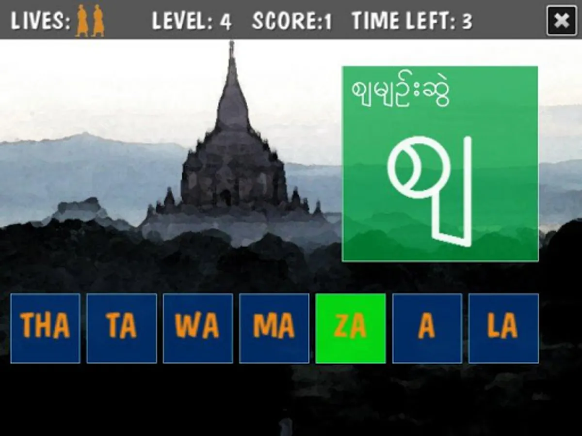 This game is quiz-like. Learn and practice the basics of Burmese alphabet and have fun doing it! Match Burmese syllables with their English counterparts. You have limited time for each round, so think fast. On each level there is less time and more options to choose from. You have three lives - you can make only three mistakes before the game is over. After you've lost the game will display your mistakes and show correct answers.