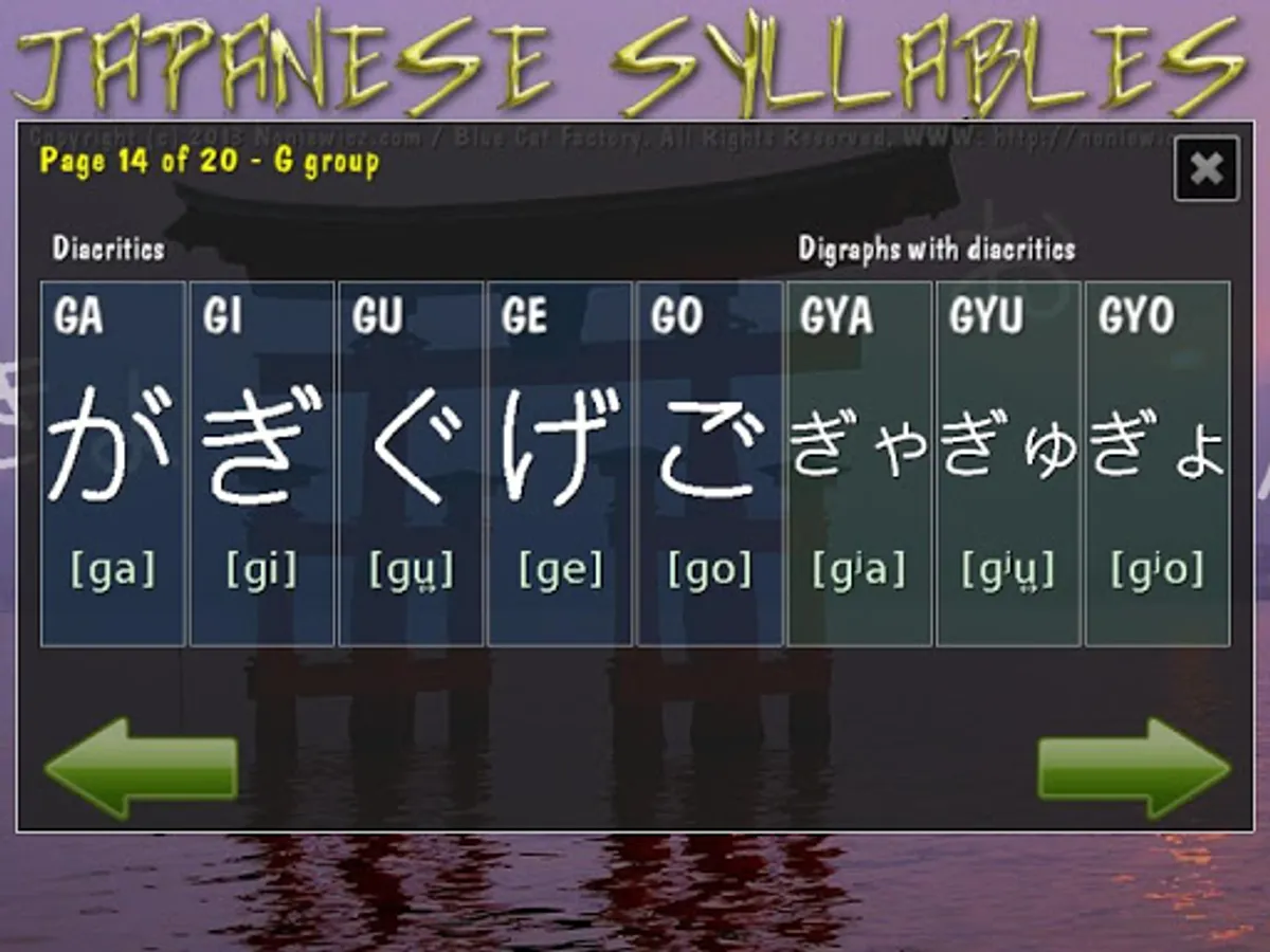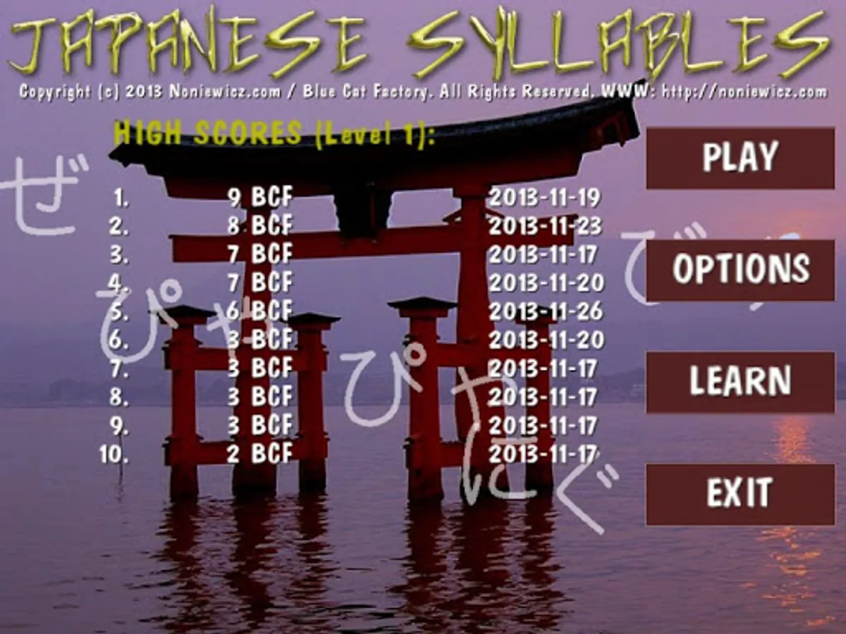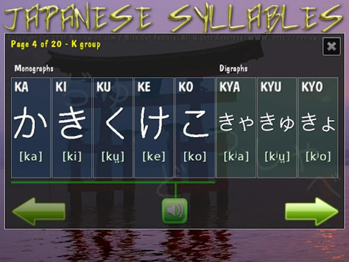 Press the LEARN button on the main screen to learn more about the Japanese syllables. The game provides phonetic notation in IPA standard that formally describes the pronunciation. Also you can hear how do the syllables sound in Japanese.