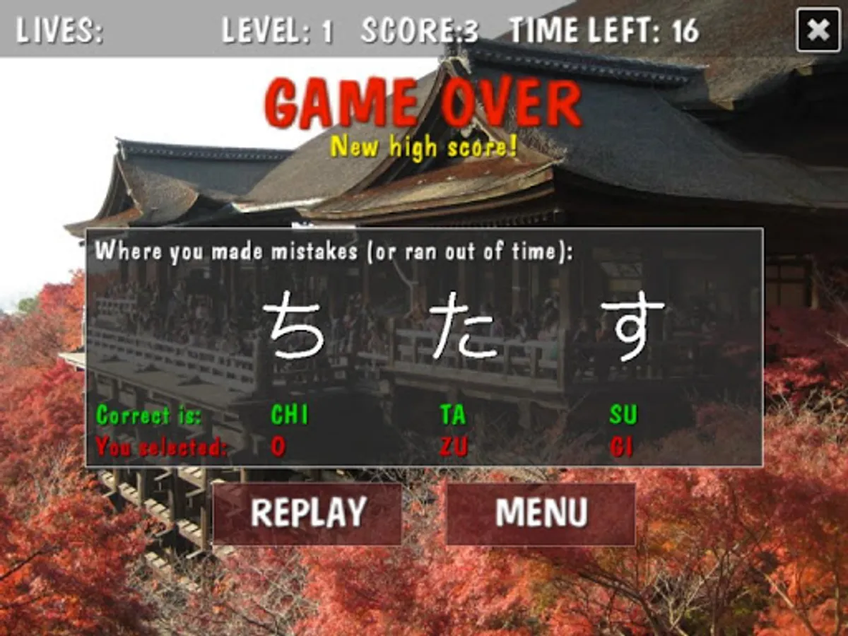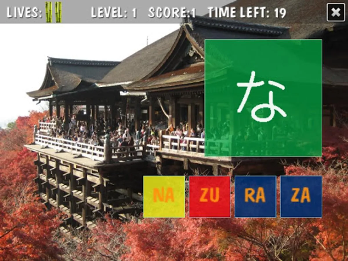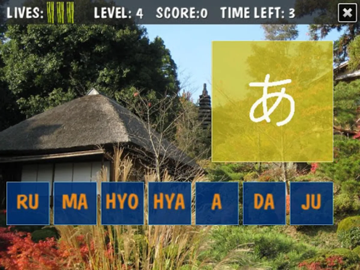 This game is similar to the Burmese Syllables and again it is quiz-like. Learn and practice the Japanese Hiragana alphabet and have fun! Match Japanese syllables with their English counterparts. You have limited time for each round, so think fast. On each level there is less time and more options to choose from. You have three lives - you can make only three mistakes before the game is over. After you've lost the game will display your mistakes and show correct answers.