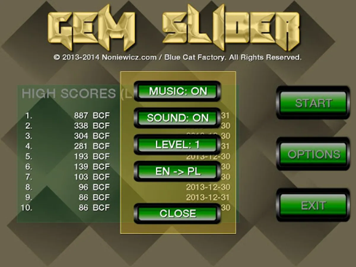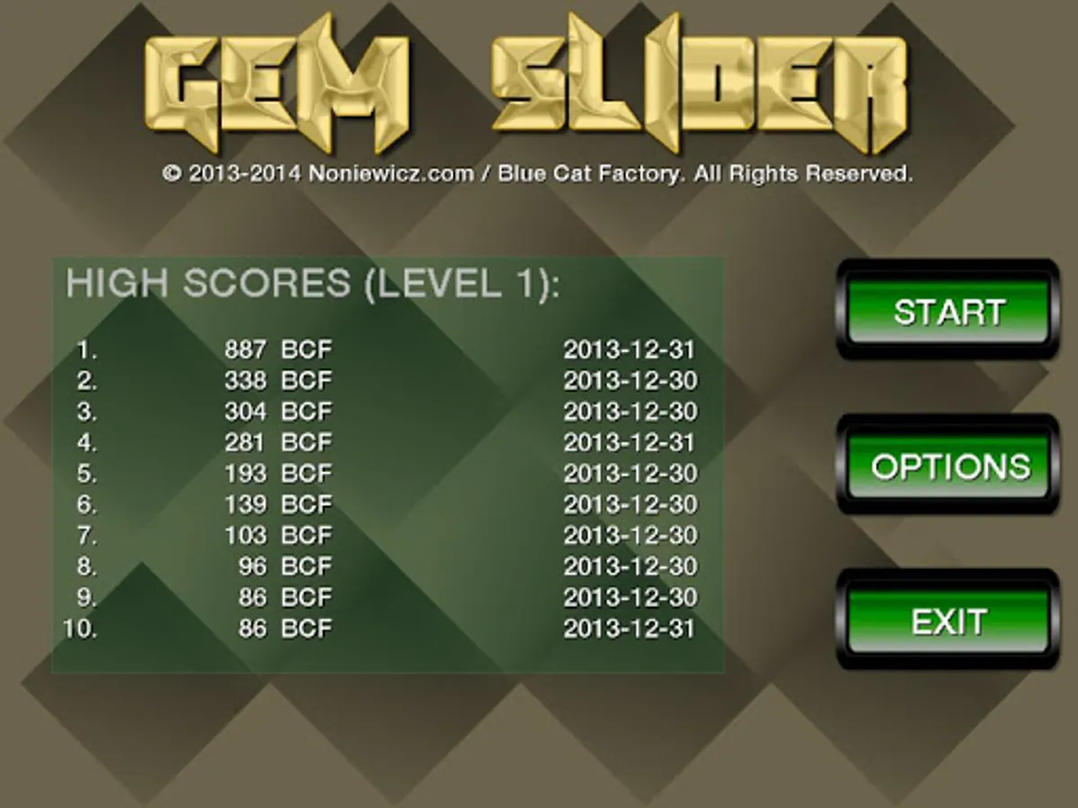 Gems of different colors pop up and you can slide them. If you put a row of five or more gems of the same color (horizontal, vertical, diagonal) they disappear and you score points. If the board is full the game is over. Gray gems (on level 1 only) act as 'jokers' and substitute any color.