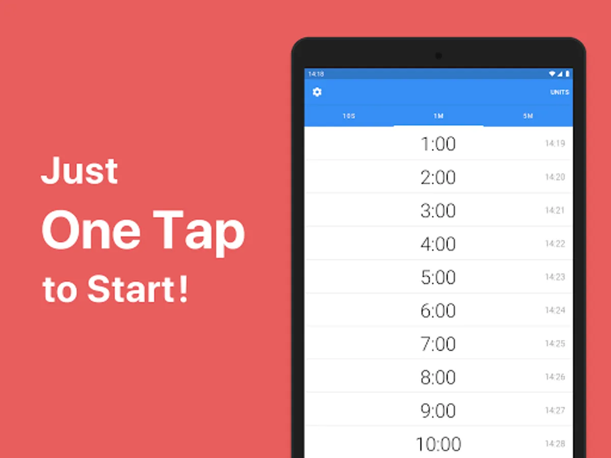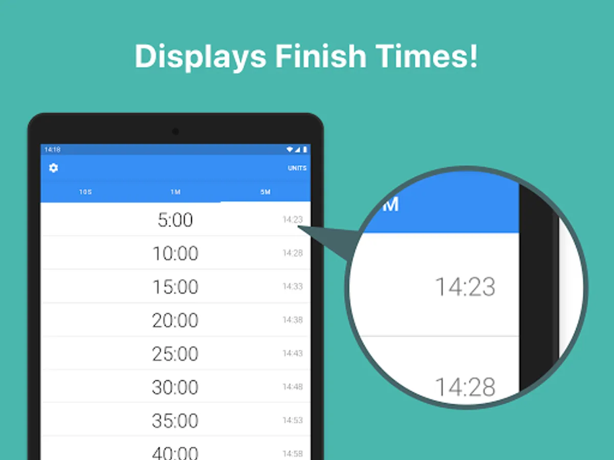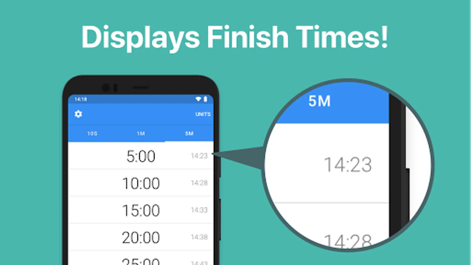 Start the timer by tapping a time in the list. Or use it as an alarm clock by choosing from a finish time.