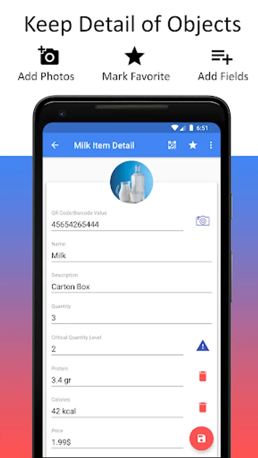You can add your objects names, pictures, barcode values and their additional information to the system. There is no limitation for the number of additional information to your objects.