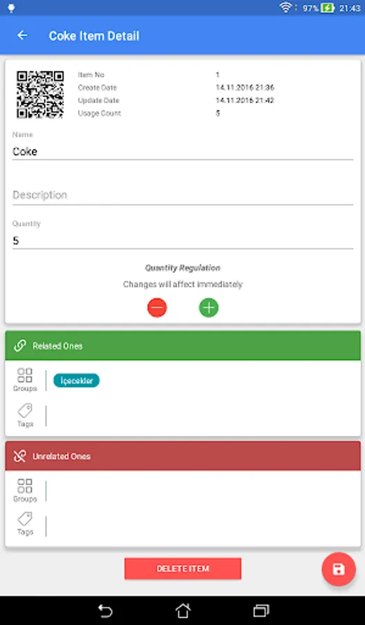 We support the most used universal 16 different type of QR Codes and universal barcode types for scanning. Scanning codes gives super easy management of your objects. Once you scan your objects you can go to that object details. By using Scanner Mode, you can change your item's quantities directly by only scanning their codes. If you do not have barcode or QR Code for your objects, our application will create it for you.