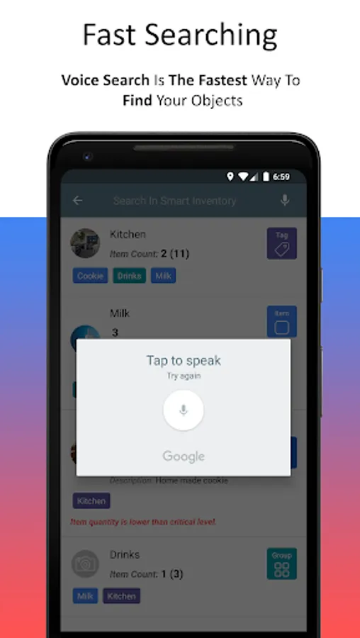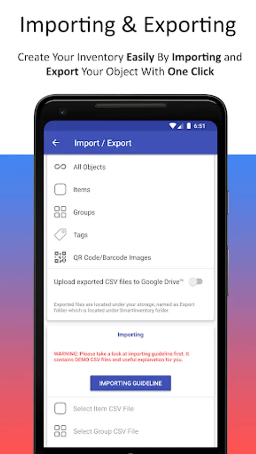 - Exporting your objects as CSV file to your phone memory or to Google Drive. Retrieve item change reports.