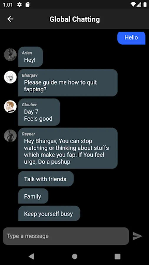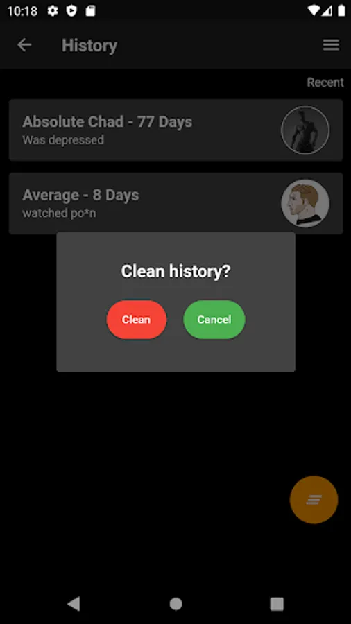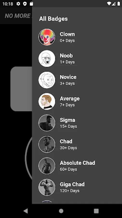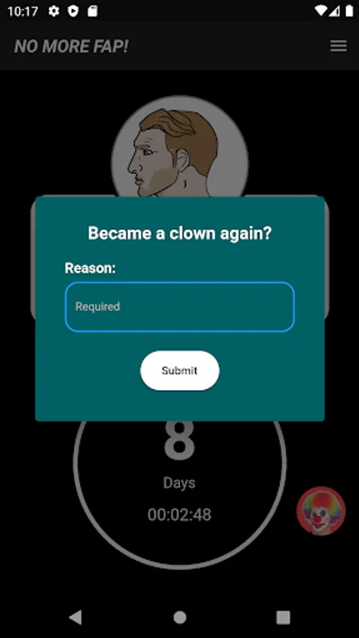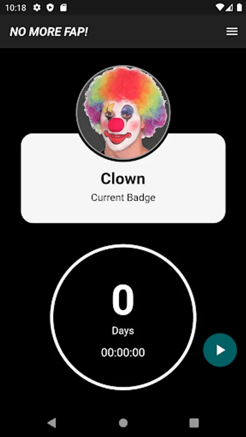 This app counts the days you have passed without fapping. Just start the timer and it will start counting. If you want to reset the timer, click on the clown icon. Write down the reason you fapped (Writing this helps to prevent doing that in the future). You can check all badges in the right drawer which will open by clicking the three-dot button in the header. Also, you can check your history by clicking the My Badge History button from the drawer. To chat with fellow nofappers, click on the chat button from Home then log in. You'll see chat channels. Start chatting!