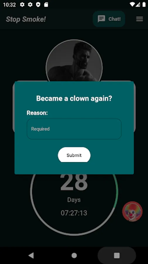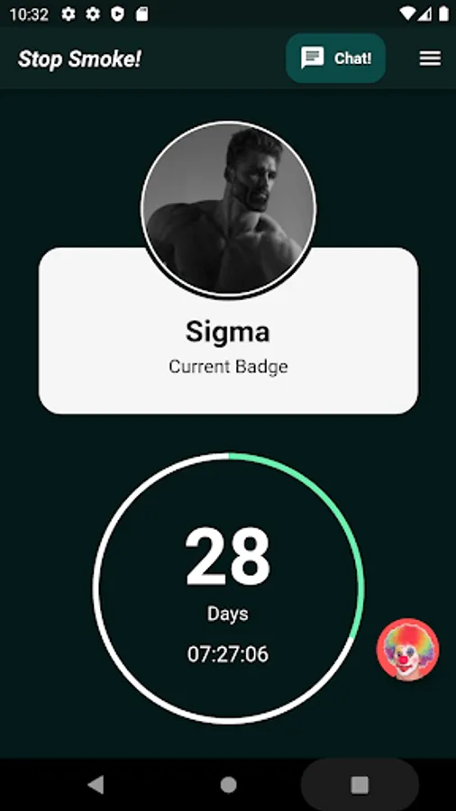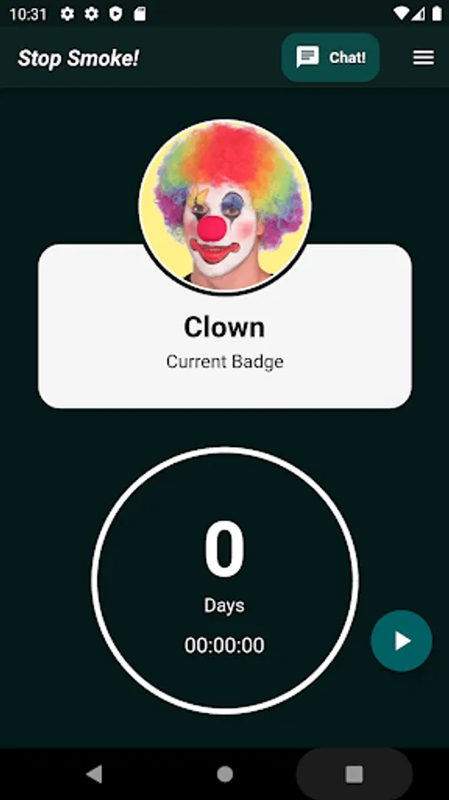 This app counts the days you have passed without smoking. Just start the timer (You can start from a previous date by selecting Old Date) and it will start counting. If you want to reset the timer, click on the clown icon. Write down the reason you smoked (Writing this helps to prevent doing that in the future). You can check all badges in the right drawer which will open by clicking the three-dot button in the header. Also, you can check your history by clicking the My Badge History button from the drawer. To chat with fellow users, click on the chat button from Home then log in. You'll see chat channels. Start chatting! Stop smoking and don’t let your cravings take over. Use Stop Smoke to help you succeed this year and every year.