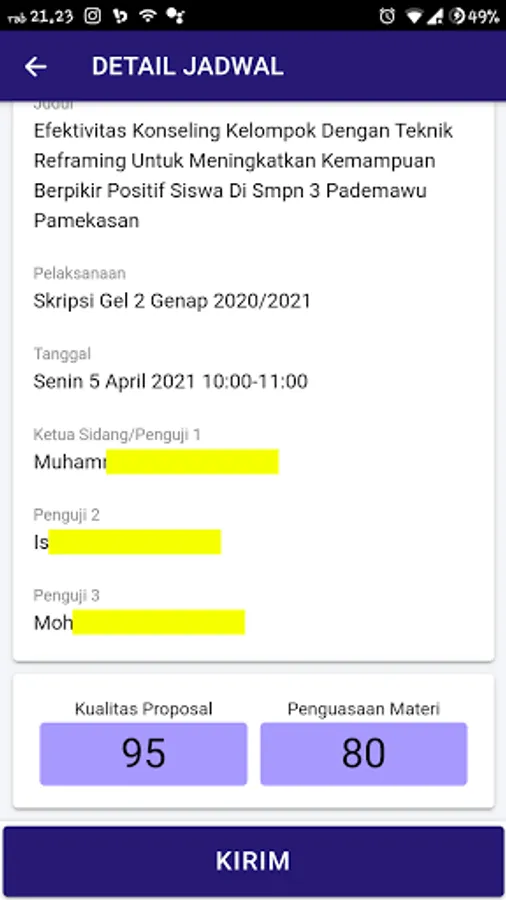 Entry of the value of the proposal or thesis exam results by each examiner lecturer, this application is a remote to make it easier to input grades, with this application it will make it easier to send grades to grade managers in the faculty