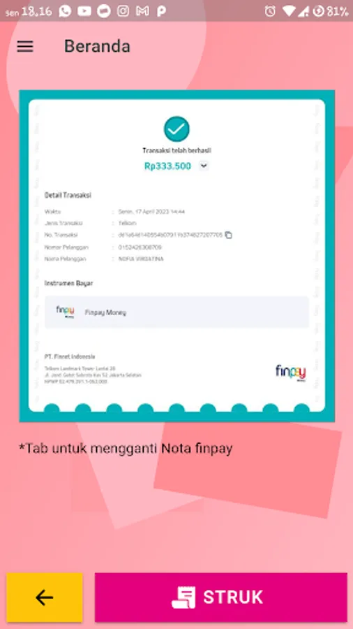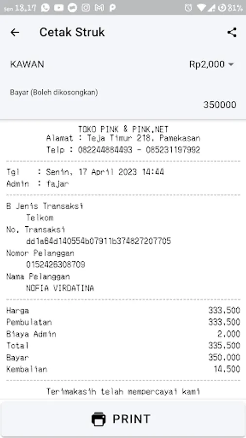 PINK NET will generate a new note with some additional information, such as admin fees and others. This application makes it easy for users to print receipts quickly and accurately, thus speeding up the transaction process at the store.