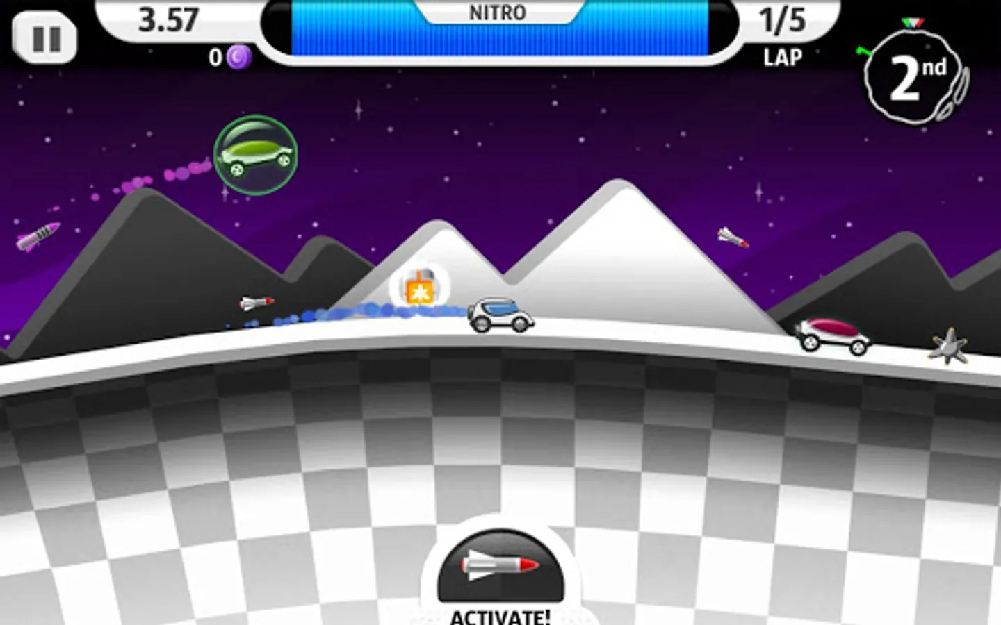 The real space race is about to begin! Sure there's racing games... but then there's racing games with powerups! Ever tried racing with homing missiles, land mines, bubble shields and gravity thrusters? Yeah, didn't think so!