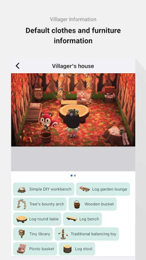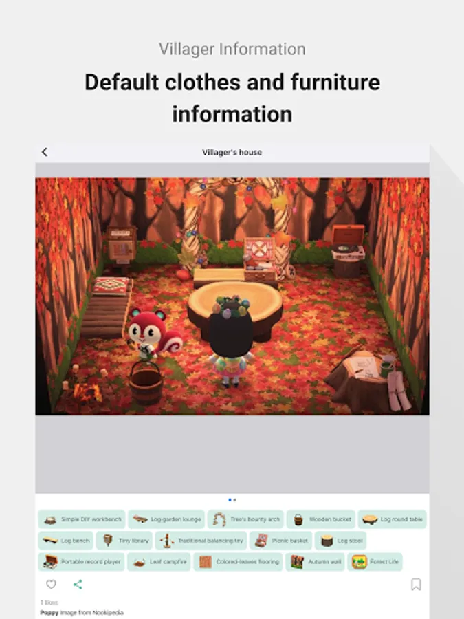 Animal Crossing villager house image with all furniture item tagged