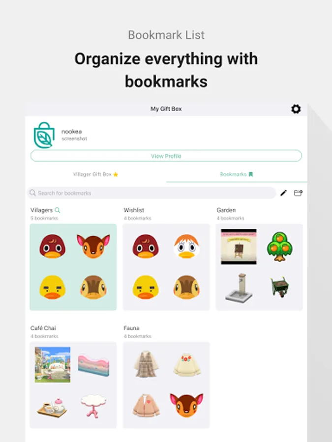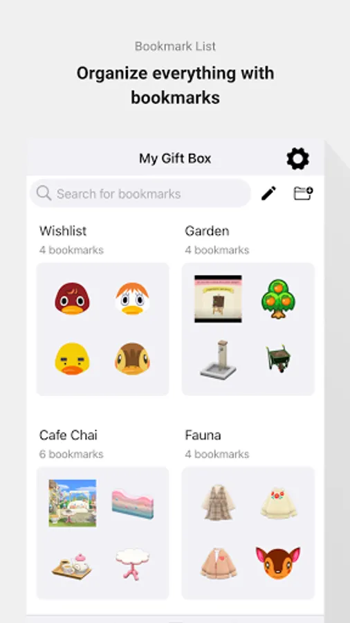 Sort bookmarks of items and custom designs into lists