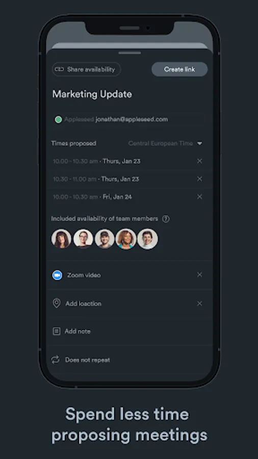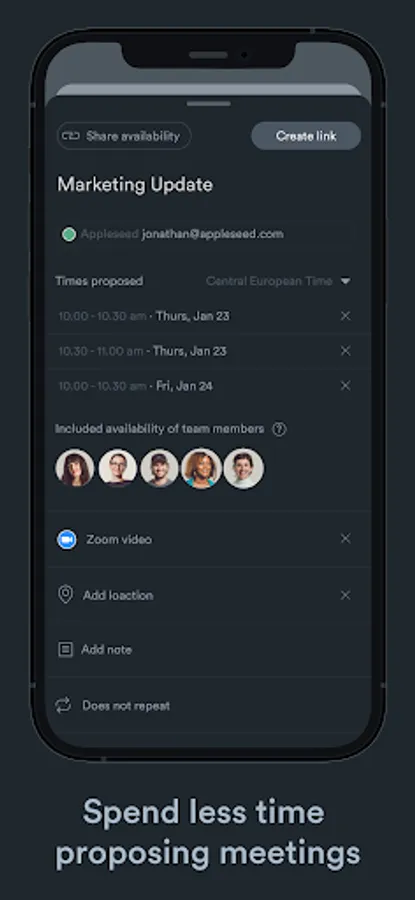 Propose meeting times: Avoid back-and-forth emails with our scheduling app and Calendly alternative. Share availability with people outside of your organization and let them book a time that works with you or your team's schedules.