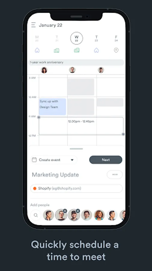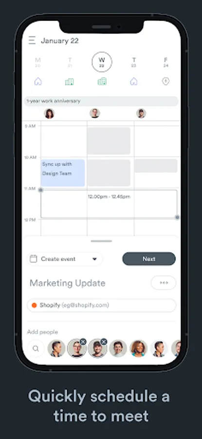 Create meetings and events: See what your team members are up to and schedule a time to meet in just a few taps.