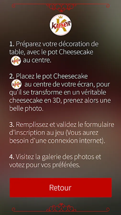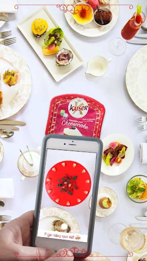 The "El Benna fi ramchet 3in" application is an augmented reality application. The idea is very simple: just prepare a nice table decoration, with the cover of the Cheesecake Kaiser jar in the center (on a plate for example).