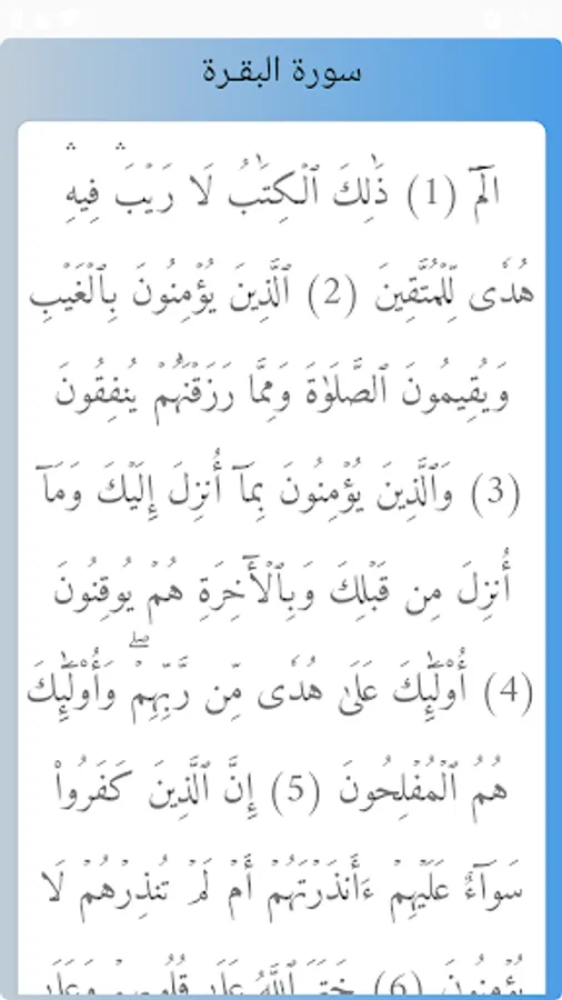This application includes Surat Al-Baqarah written in a large font, with the ability to read and recite the surah without the need for the Internet.
