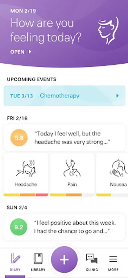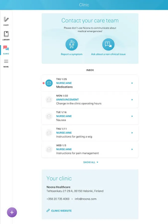 The Noona® software application provides cancer patients with direct access to their care team during active treatment and follow up. Patients can report symptoms as they occur, update the care team on their general wellbeing, or respond to an inquiry on how they feel in between clinic visits. Patients can also view their lab results, medical records and clinic appointments. All self-care instructions and other communication sent by the care team are securely stored in the patient inbox.