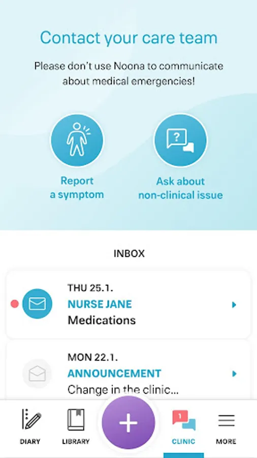 The Noona® software application provides cancer patients with direct access to their care team during active treatment and follow up. Patients can report symptoms as they occur, update the care team on their general wellbeing, or respond to an inquiry on how they feel in between clinic visits. Patients can also view their lab results, medical records and clinic appointments. All selfcare instructions and other communication sent by the care team are securely stored in the patient inbox.