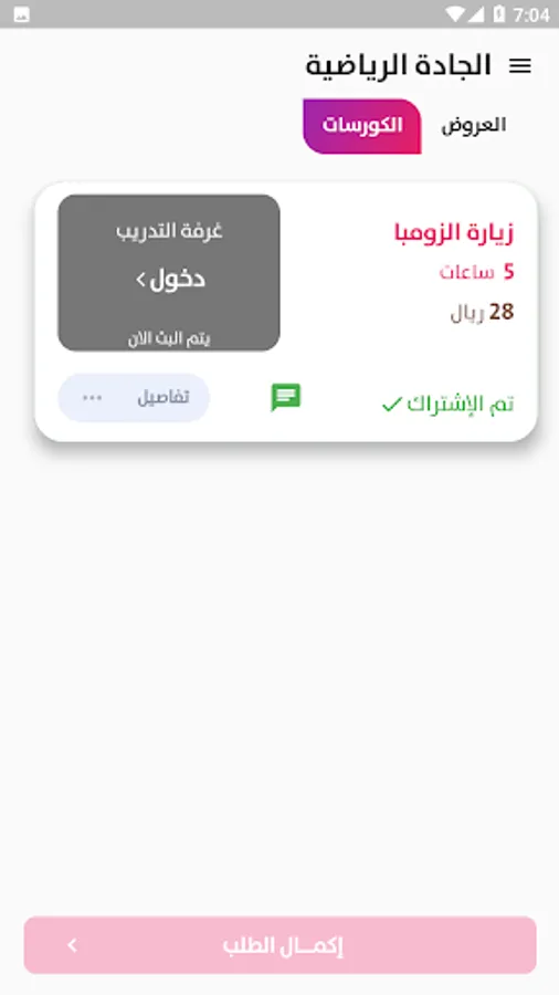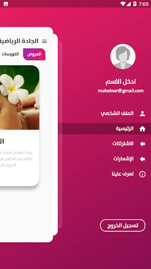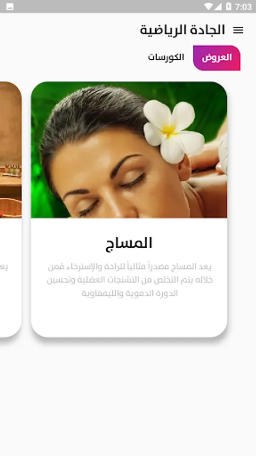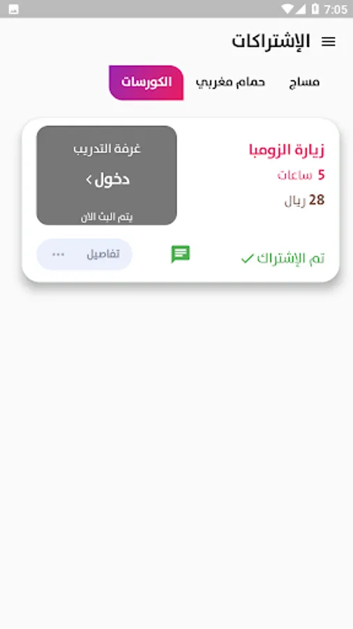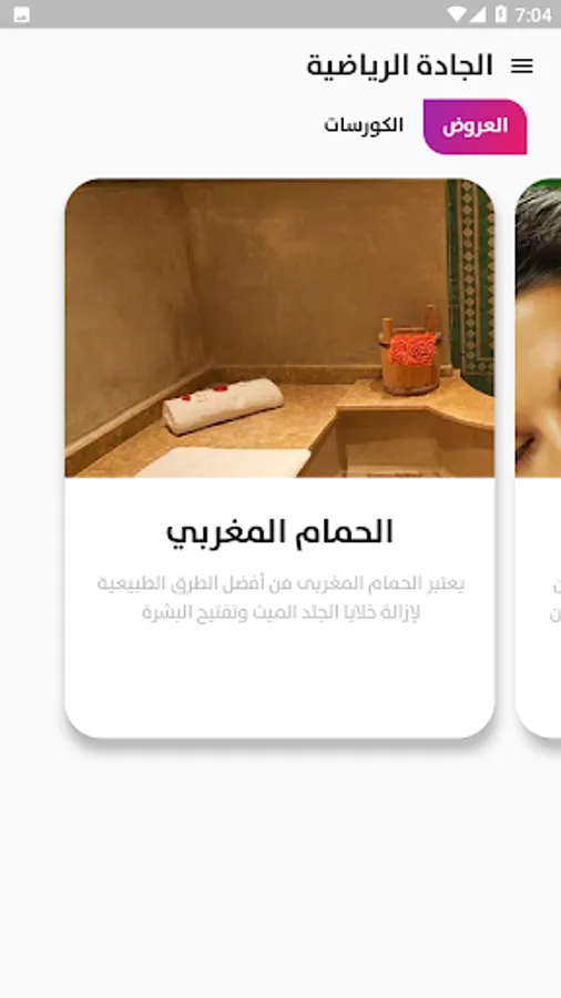 Application for sports services, health massage and Moroccan bath. And visits to belly dancing and swimming