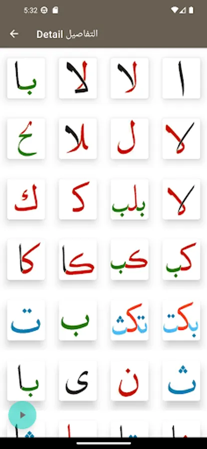 Students learn recognition of letters in individual and compound forms. This application help them with audio and Arabic Alphabets. They learn proper sounds of each letter. They learn how long should a movement be streched.