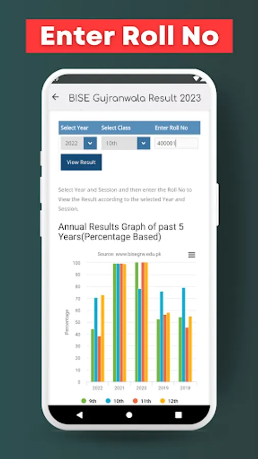 The application allows you to see the results of the 9th, 10th, 11th, and 12th examinations held by the BISE Gujranwala Board. Students can actually look at their results by entering simply their Roll No.