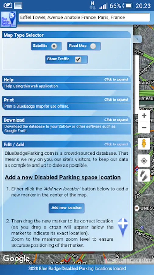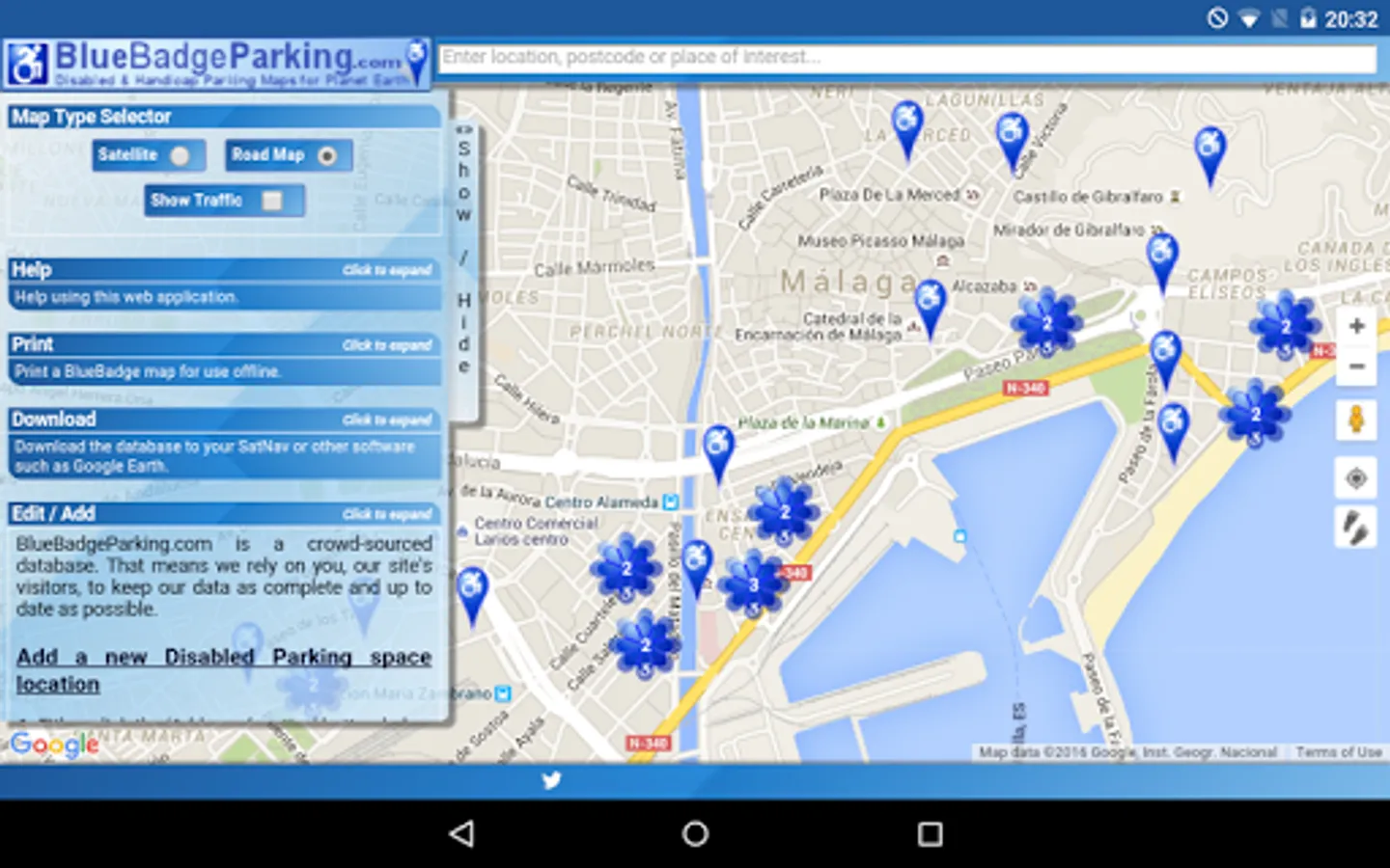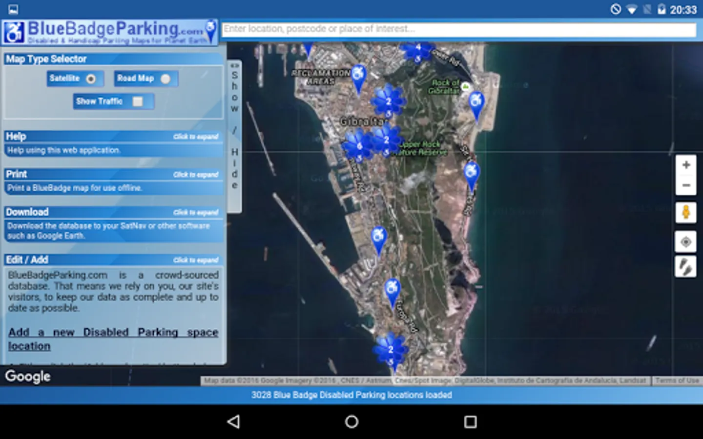 BlueBadgeParking.com is the worlds biggest and most up to date crowd-sourced map of disabled / handicap parking spaces. It has been online since 2006 and is the world's leading disabled (handicap) parking map website. It is a crowd-sourcing project bringing together people around the world to build the most comprehensive and most up to date database of disabled parking spaces. Maps can be printed or downloaded to your SatNav device from the website.