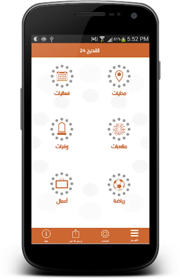 الأقسام الرئيسية : محليات ، فعاليات ، مناسبات ، وفيات ، رياضة ، و أعمال.
