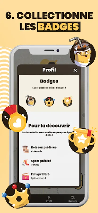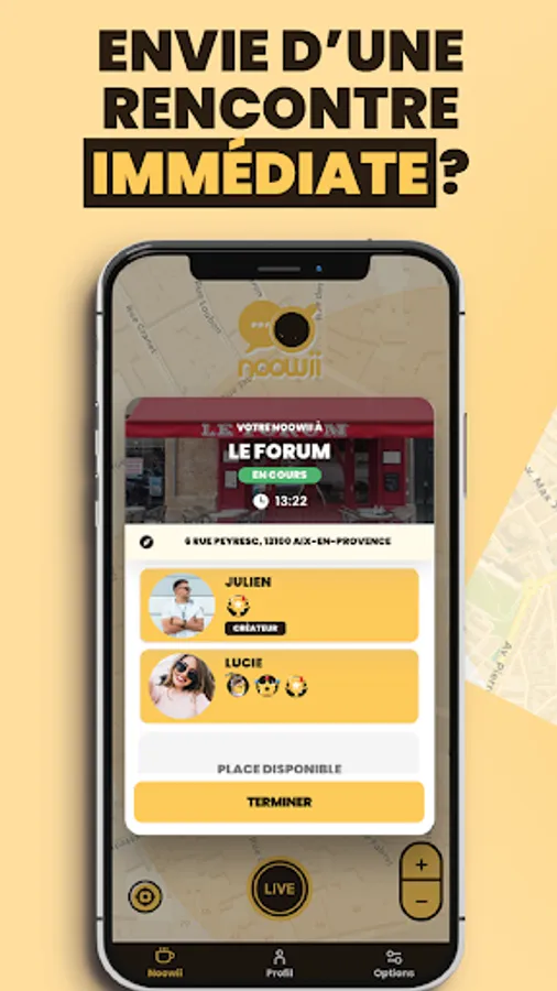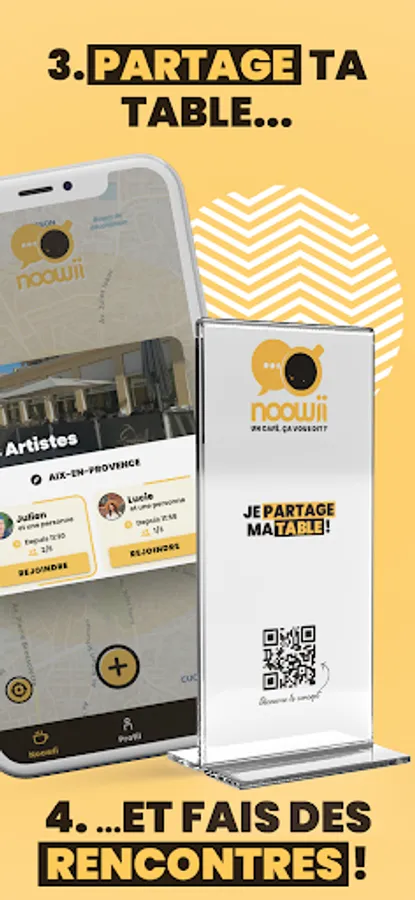 Are you arriving in a new city in search of new encounters? Choose a nearby café, bar or restaurant, indicate the number of seats around your table and let Noowii take care of the rest! As you meet, collect badges!