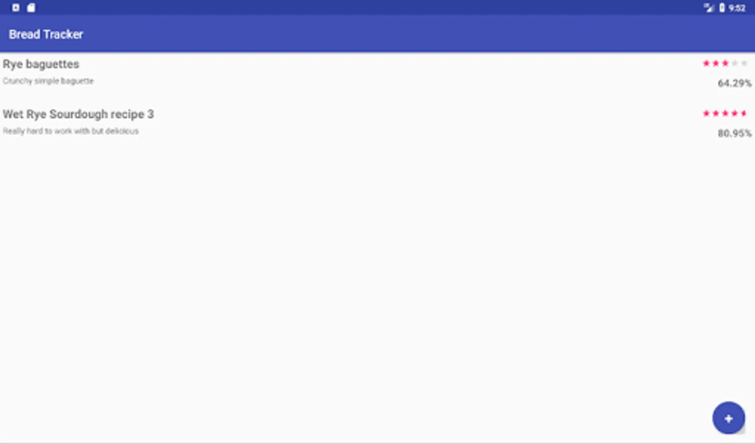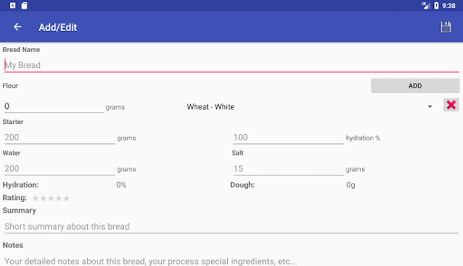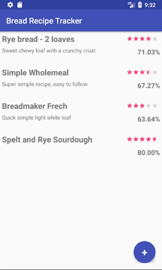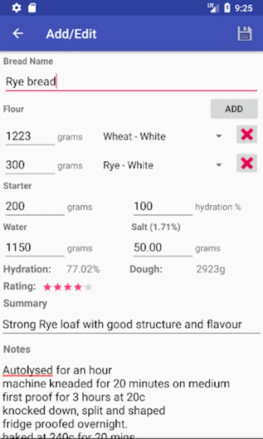 Easy management and reference for bread recipes with loaf/recipe rating, hydration and salt percentage calculators. Store detailed notes against your bakes for proof times and methods, cooking times and temperatures.