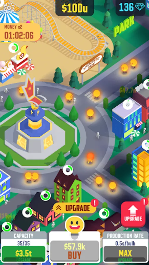 In these idle tap-tap and clicker games you can unlock and improve many buildings and enjoy the amusement park. Earn cash, purchase upgrades, produce lightbulbs faster and expand the city in money idle games. Plunge into with this unique & addictive idle button simulator. The time has come to build new electric empire!