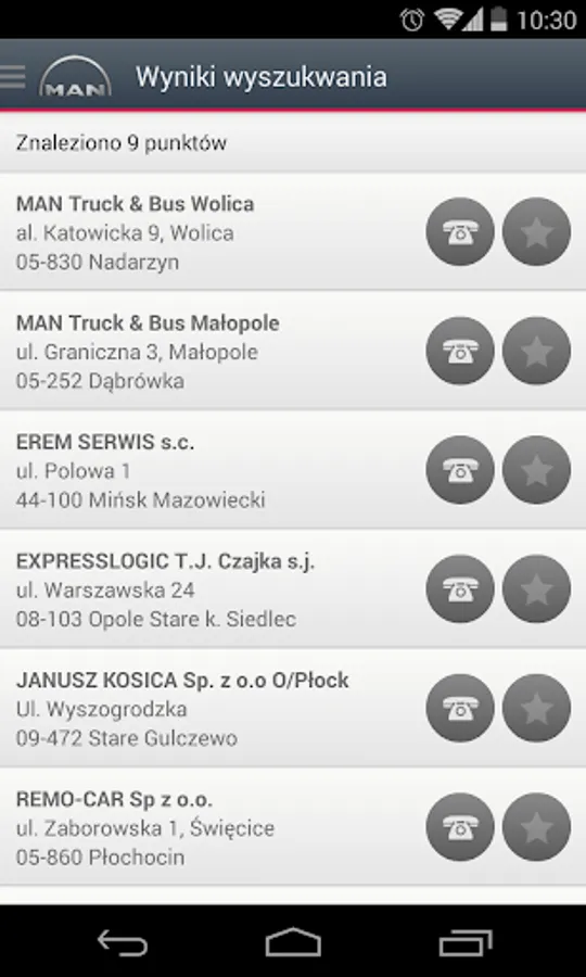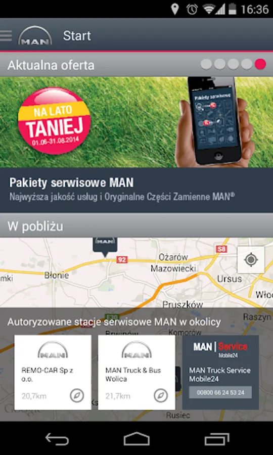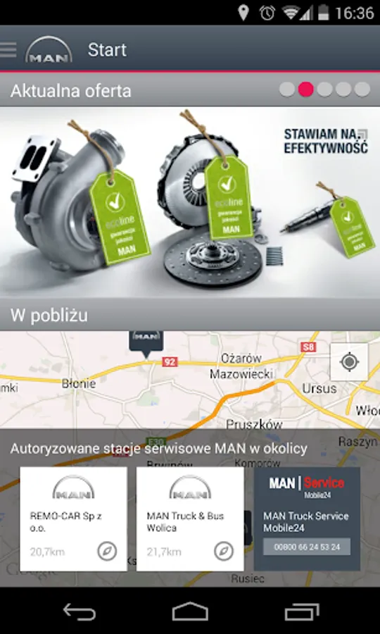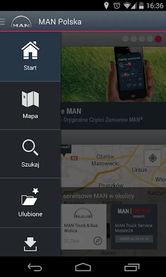 Service MAN Poland, the original application prepared by MAN Truck & Bus Polish on your smartphone. It is addressed to users of MAN vehicles. It contains useful information about shopping and service network MAN in Polish, as well as information about special offers spare parts and maintenance services. Geolocation service quickly and easily inform nearest local retail and service and navigate to them. Easy to search services according to different criteria such as the sale of new and used vehicles, sales of spare parts or service vehicles ensures rapid contact with that point.