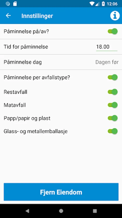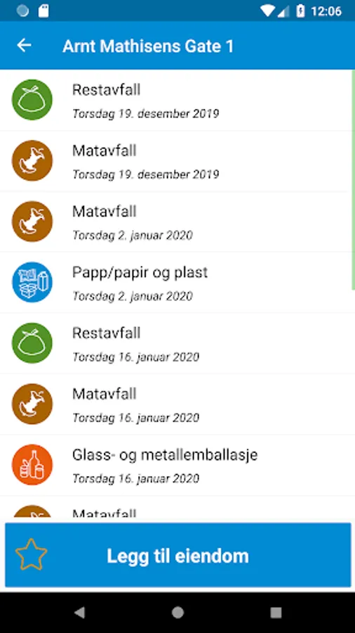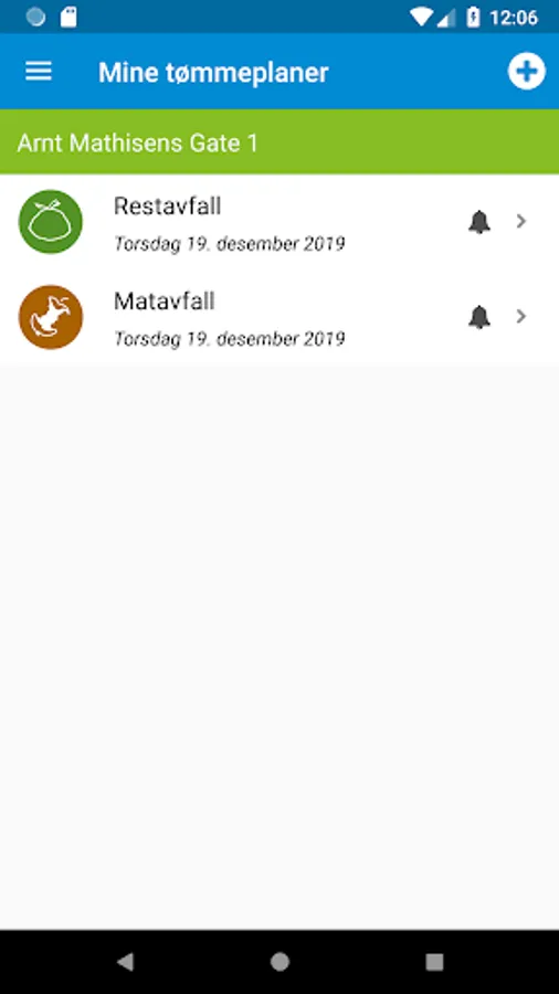 The emptying plan shows the dates and type of waste to be emptied for the selected property. Alert the day before the empty day is automatically set, but can be changed in settings. It is also possible to choose notification only for certain types of waste.