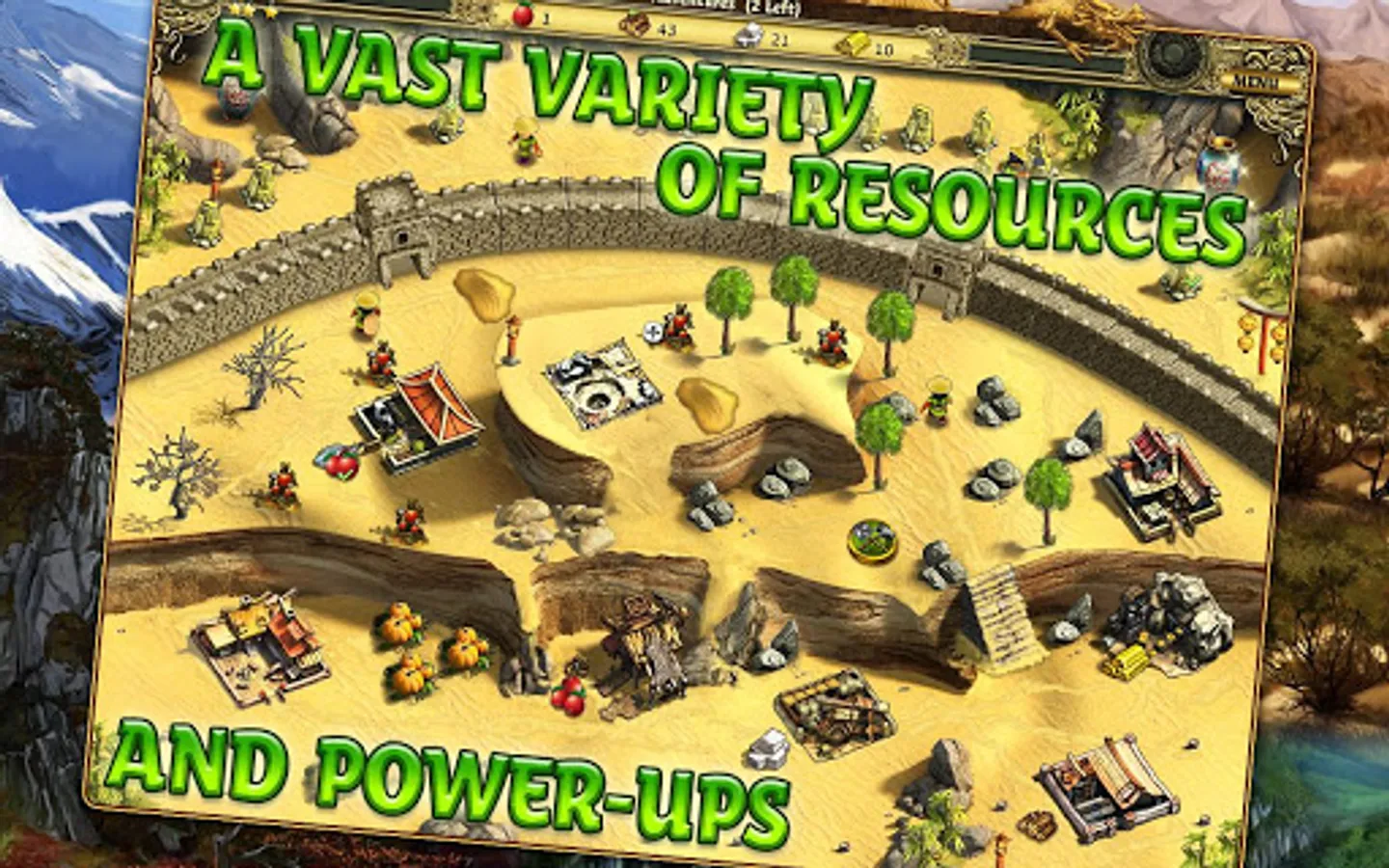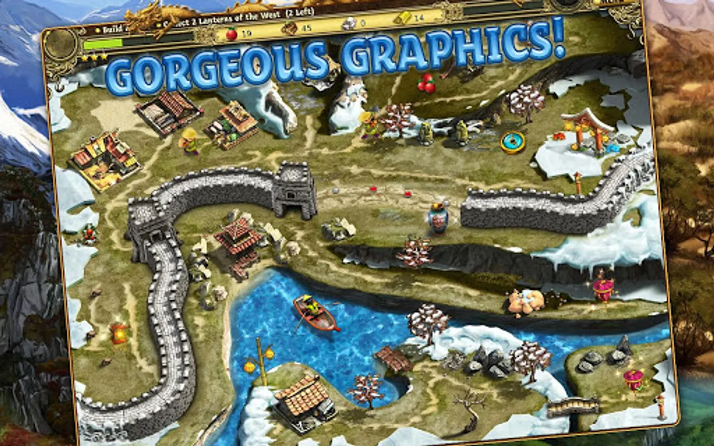 The Chinese Empire is in grave danger as the Nomads from the North threaten the wealth and prosperity of its lands. Kong Baotu, a smart and resourceful man, accepts the challenge to achieve the impossible. He commits himself to building the Great Wall that will protect China from the warlike barbarians. In return, he asks for permission to marry the Emperor's beautiful daughter, Fan Tanrui. Join Kong in his epic adventure! Help him save the Empire and marry Fan. Your journey will take you to the farthest reaches of China, through the emerald-green hills and treacherous rocky cliffs. In more than 40 levels, you will conquer the snowy mountain-peaks and cross the withering deserts. You will gather food and lumber, mine stone and iron, survive hurricanes and thunderstorms, all for the noble goal of completing the greatest building in the history of mankind – The Great Wall of China.