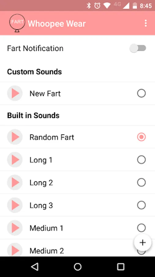 Record or add your own farts from your device to give a personalized experience by clicking the plus button in the top bar.