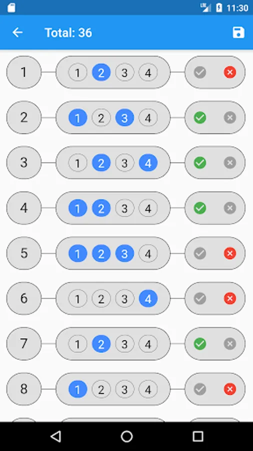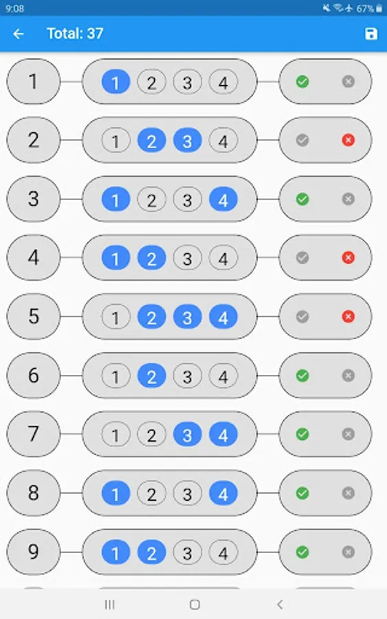 Answer to each question with "1", "2", "3" or "4", or all at once. If you're not sure of a question, answer and tap the "wrong" icon in the right section until you ask your instructor.