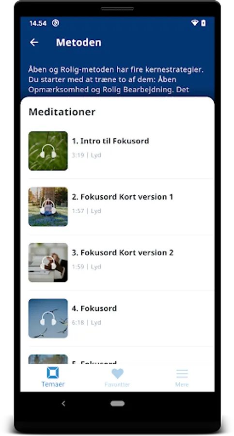 The app has been technically significantly improved in relation to the first two versions (anno 2016 and 2019). The app structures the meditations according to Åben and Rolig's five themes: The Method, The Body, The Psyche, Relationships and The Focus You Want. With the app you also get easy access to www.åbenogrolig.dk. Here you can order books and download extra material, find your personal team times, etc. The Open and Calm app is published by the Mental Health Foundation, which works for non-profit purposes for the benefit and joy of the Danish population.